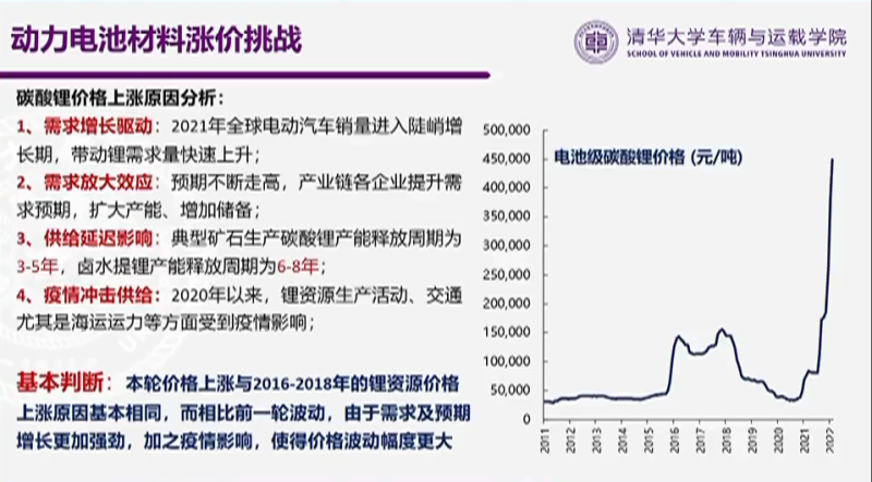 其中以碳酸鋰為例,作為新能源汽車動(dòng)力電池的主要原材料,其現(xiàn)階段售價(jià)已超過每噸50萬元,過去一年上漲了十余倍。對(duì)此,中國(guó)科學(xué)院院士 歐陽明高分析指出,此輪碳酸鋰價(jià)格高增的原因主要源于去年以來全球新能源汽車需求飛速增長(zhǎng),在電池和材料領(lǐng)域產(chǎn)生了遞進(jìn)式需求放大效應(yīng),整體與2016~2018年的鋰資源價(jià)格上漲原因基本相同,但相較于前一輪波動(dòng),此輪疊加疫情影響,價(jià)格波動(dòng)幅度更大一些。