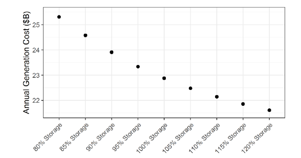 需要注意的是,年發(fā)電成本會隨著儲能系統(tǒng)在100%儲能系統(tǒng)敏感性的減少而增加,并且隨著儲能系統(tǒng)的增加而降低。這條曲線說明了隨著更多儲能系統(tǒng)添加到電力系統(tǒng)中,儲能裝機容量的增量將如何減少。例如,在80%到85%的儲能敏感性之間,增加33GW的儲能系統(tǒng)可以將年發(fā)電成本降低7.32億美元。相比之下,在115%到120%的儲能場景中,增加33GW的儲能系統(tǒng),總成本只降低了2.48億美元。這一研究表明,隨著裝機容量的增加,儲能系統(tǒng)的套利機會將會減少。