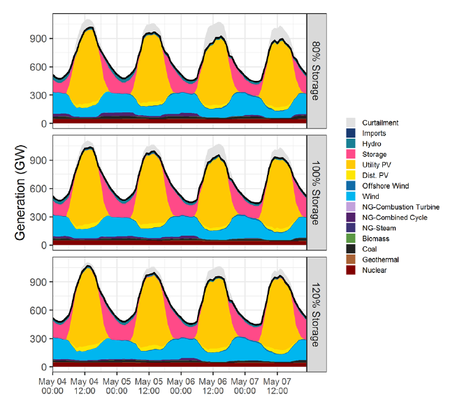圖11顯示了2050年5月其中的四天時間里三種儲能系統(tǒng)的敏感性(80%、100和120%)的電力系統(tǒng)調度。80%的儲能系統(tǒng)敏感性表明出現(xiàn)大量削減(特別是在5月6日中午左右,當時正在發(fā)生150GW以上的削減)。100%的儲能系統(tǒng)敏感性和120%儲能系統(tǒng)敏感性的削減都在下降,并且在120%儲能系統(tǒng)的敏感性中僅低于100GW。每日調度還表明,相對于80%的儲能敏感性,在100%和120%的儲能敏感性場景中,太陽能發(fā)電時間增長而導致內天然氣發(fā)電量減少。