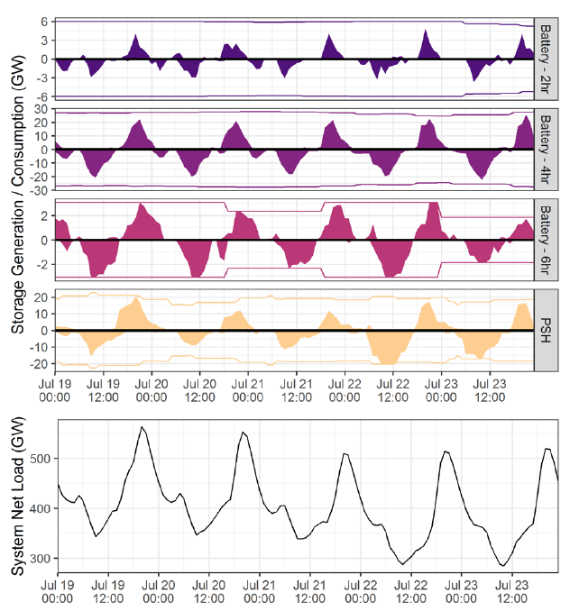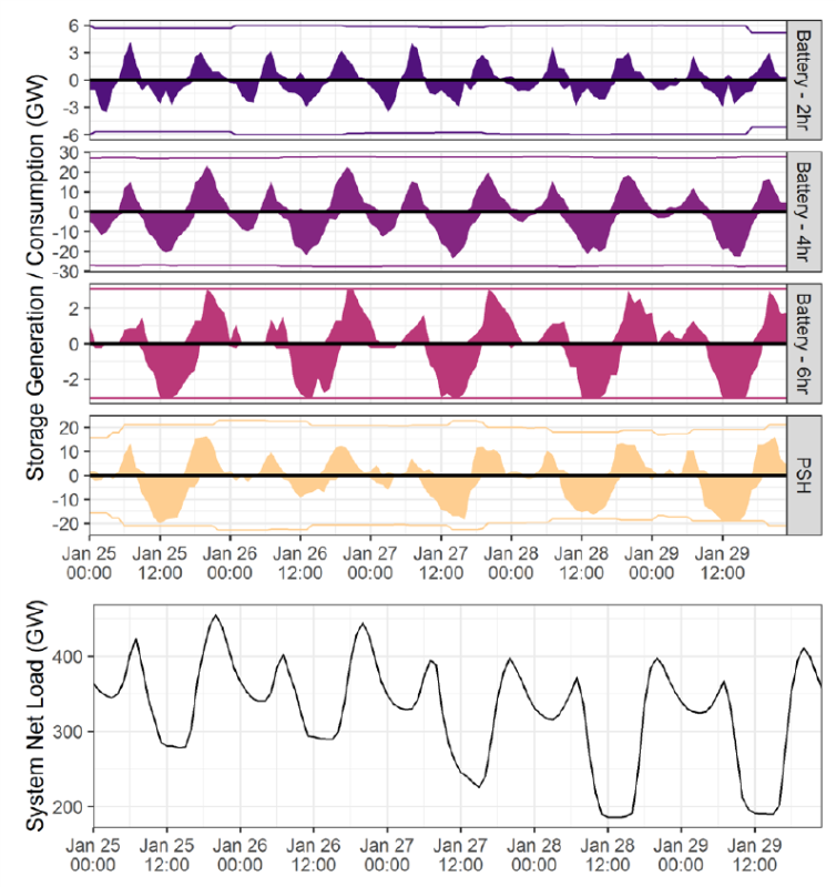 圖10.2030年低成本太陽能發(fā)電場景中各種儲能技術夏季的操作(上圖),以及系統(tǒng)凈負載(下圖)。對于頂部面板,實心區(qū)域表示儲能系統(tǒng)裝機容量調度,實線表示總可用裝機容量