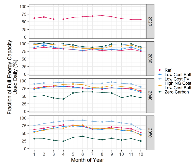 圖8.每日放電的儲能容量百分比,按月和場景顯示