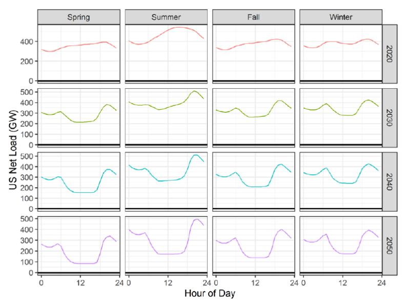 為了展示儲能系統(tǒng)在分析時間范圍內不斷變化的作用,首先看看電力系統(tǒng)變化的其他驅動因素。例如,太陽能發(fā)電和風力發(fā)電設施的快速部署是近年來發(fā)電技術不斷變化的一個重要因素。圖6顯示了到2050年高天然氣成本/低成本電池場景的晝間(每日)平均凈負荷(電力需求減去發(fā)電量)。在2020年,通常看到典型的負荷曲線在夜間最低,而在夏季的傍晚最高。到2030年,大量增長的太陽能發(fā)電量(占總發(fā)電量的14%)改變了凈負荷曲線的形狀,減少了中午的凈負荷,并在傍晚的時候推遲了晚高峰。所有季節(jié)都顯示出在日出之前出現(xiàn)的第二個早高峰。這些特征將在2040年和2050年持續(xù)存在并加劇,因為太陽能發(fā)電量將分別增加到20%和23%。