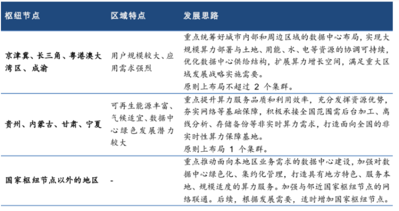 我國數(shù)據(jù)中心大多分布在東部地區(qū),由于土地、能源等資源日趨緊張,在東部大規(guī)模發(fā)展數(shù)據(jù)中心難以為繼。而西部地區(qū)資源充裕,特別是可再生能源豐富,具備發(fā)展數(shù)據(jù)中心、承接?xùn)|部算力需求的潛力。“東數(shù)西算”有利于推動數(shù)據(jù)中心合理布局、優(yōu)化供需,提升國家整體算力水平,擴(kuò)大有效投資,推動區(qū)域協(xié)調(diào)發(fā)展,具有多方面多層次重要意義。我國算力網(wǎng)絡(luò)各類樞紐節(jié)點(diǎn)定位及發(fā)展思路見表3。本次“東數(shù)西算”的全面啟動,疊加數(shù)字經(jīng)濟(jì)確定的發(fā)展方向,對于整個數(shù)通側(cè)將是確定性大機(jī)會,算力、流量持續(xù)高速增長是必然趨勢,配套基礎(chǔ)設(shè)施持續(xù)建設(shè)擴(kuò)容是剛性需求,未來3~5年具有高確定性。