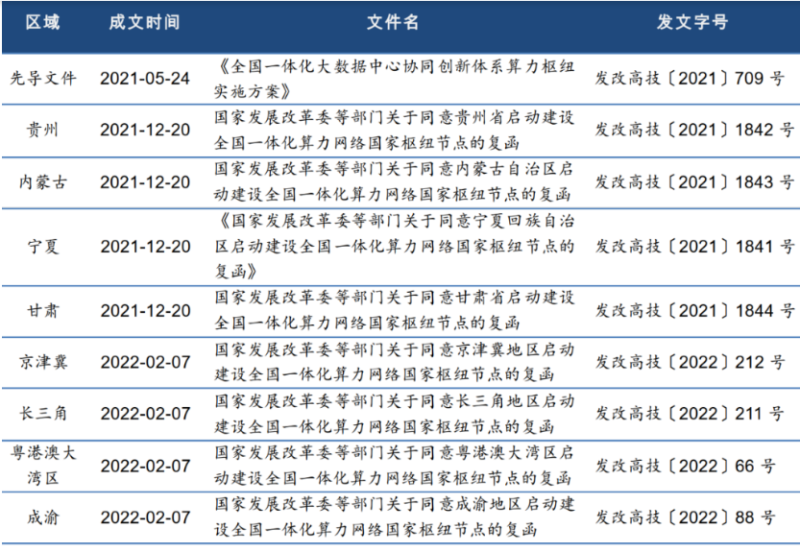 數(shù)字時代正在召喚一張高效率的“算力網(wǎng)”?!皷|數(shù)西算”是把東部密集的算力需求有序引導(dǎo)到西部,使數(shù)據(jù)要素跨域流動。打通“數(shù)”動脈,織就全國算力一張網(wǎng),既緩解了東部能源緊張的問題,也為西部開辟一條發(fā)展新路。與“東數(shù)西算”相關(guān)文件的主要政策文件見表2。