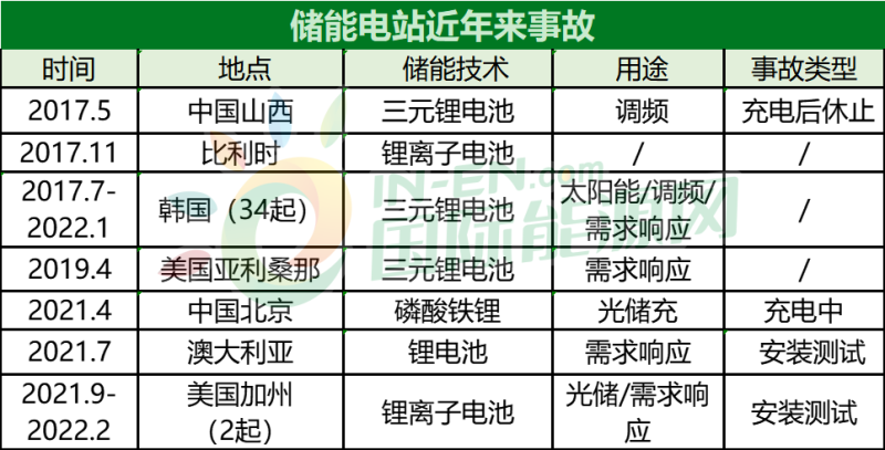 2017-2022全球儲能電站火災(zāi)情況(部分)