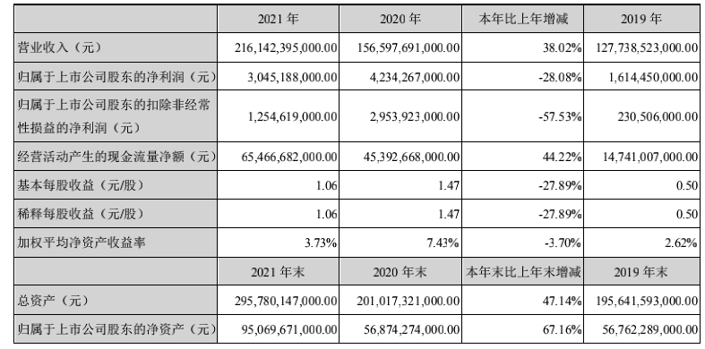 中國儲能網(wǎng)訊:3月29日晚間,比亞迪(002594.SZ)對外發(fā)布的2021年全年業(yè)績報告顯示,公司2021年實現(xiàn)營業(yè)收入約2161.42億元,同比增長38.02%;歸屬于上市公司股東的凈利潤盈利約為30.45億元,同比減少28.08%。