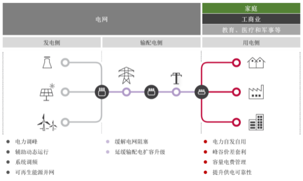 在發(fā)電側(cè),儲(chǔ)能可應(yīng)用于電力調(diào)峰、輔助動(dòng)態(tài)運(yùn)行、系統(tǒng)調(diào)頻、可再生能源并網(wǎng)等;在用電側(cè),儲(chǔ)能可應(yīng)用于峰谷價(jià)差套利、容量電費(fèi)管理、電力自發(fā)自用、提升供電可靠性等;在輸配電側(cè),儲(chǔ)能可應(yīng)用于緩解電網(wǎng)阻塞、延緩輸配電擴(kuò)容升級(jí)、根據(jù)區(qū)域電網(wǎng)負(fù)荷及時(shí)進(jìn)行調(diào)峰調(diào)頻等。