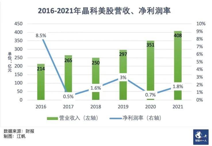 低價及市占率優(yōu)先曾是晶科的重要策略,穩(wěn)固了其全球組件老大的位置,也帶來了利潤過低的問題。2017年,在市場需求超預期增長和原材料價格大漲的情況下,晶科依舊執(zhí)著于市場份額,犧牲利潤選擇代工生產(chǎn)。當年,其在營收增長23%至265億元的情況下,凈利潤同比下滑92%僅1.4億元,為五年來最低水平。