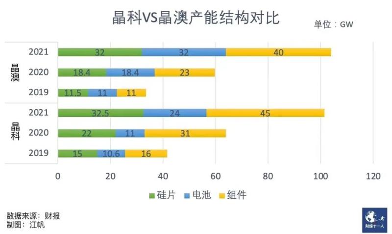 晶科與晶澳的產(chǎn)能結(jié)構(gòu)相同。從上圖可以看出,晶澳2019年底回A后擴產(chǎn)加速,2020年縮小與晶科產(chǎn)能差距,2021年反超,且電池一體化程度更高。