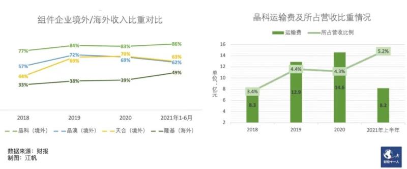 全球化布局是晶科堅守多年的戰(zhàn)略,其在組件龍頭中海外銷售占比最高。這樣的業(yè)務結(jié)構(gòu)使其在2021年國際海運運力緊張的形勢下格外受創(chuàng)。
