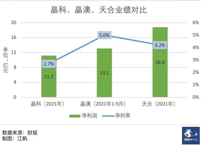 2021年,天合、晶科分別實現(xiàn)營收445億元、405億元,前者凈利是后者的1.7倍;而晶澳前三季度凈利就已高出晶科全年凈利1.9億元。這樣的情況已持續(xù)了兩年:2020年這三家中晶科的營收最高,凈利卻最低。