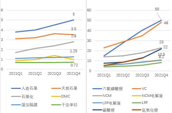 1. 鋰礦原料漲價(jià),使得鋰資源直接成為了“白色石油”。漲幅季度同比:氫氧化鋰漲幅2.5~3倍,碳酸鋰漲1.5~2倍,磷酸鐵鋰漲1倍,三元正極漲0.5~1倍,電解液漲0.8~1.2倍,六氟磷酸鋰漲2~2.5倍,人造石墨漲1~1.5倍,石墨化漲1.5~2.0倍。