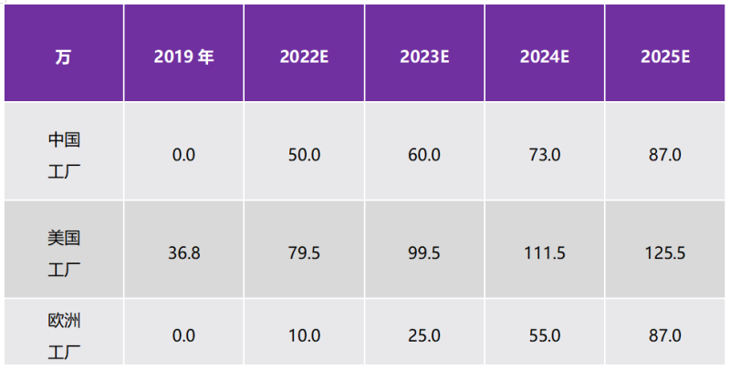 2. 電動化宏偉目標(biāo)的達(dá)成,需要多種動力電池技術(shù)加持。特斯拉中長期產(chǎn)銷量可期:預(yù)計(jì)到2025年,特斯拉產(chǎn)銷量有望達(dá)到300萬輛,其中中國87萬輛,歐洲87萬輛,美國126萬輛。