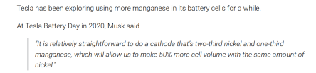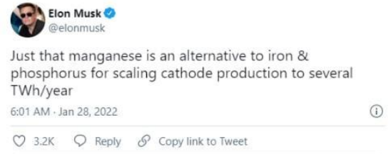 中國儲能網(wǎng)訊:根據(jù)海外媒體inside EVS的消息,馬斯克稱特斯拉一直在探索在電池中使用更多錳,并且認(rèn)為錳具有潛力。