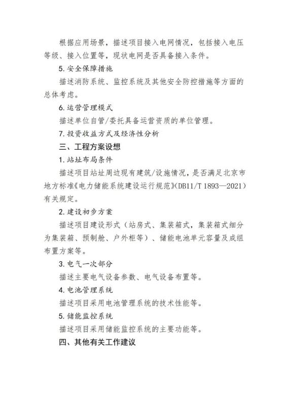 新型儲能項目應結(jié)合電源側(cè)、電網(wǎng)側(cè)、用戶側(cè)多元化需求布局建設,本次征集新型儲能項目應符合國家標準、行業(yè)標準及北京市地方標準《電力儲能系統(tǒng)建設運行規(guī)范》(DB11/T 1893-2021)等相關(guān)要求,不得使用梯次利用動力電池。申報項目經(jīng)過評估,對符合條件的項目納入《北京市"十四五"新型儲能發(fā)展專項規(guī)劃》,作為項目建設支撐依據(jù)。