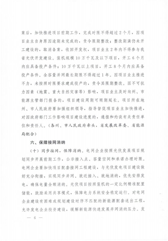 (九)推動項目加快建設,限期投產(chǎn)。各州、市人民政府應督促項目業(yè)主在取得開發(fā)權后,1個月內(nèi)完成項目備案。完成備案后,加快推進項目前期工作,完成時限不得超過2個月,因項目業(yè)主自身原因逾期未完成的,責令限期整改;整改期滿仍未開工建設的,取消備案,收回開發(fā)權,項目業(yè)主2年內(nèi)不得參與我省光伏開發(fā)建設。裝機規(guī)模10萬千瓦及以下項目,開工6個月內(nèi)應具備投產(chǎn)條件;10萬千瓦以上項目,開工8個月內(nèi)應具備投產(chǎn)條件。全容量并網(wǎng)最長期限不得超過1年。因項目業(yè)主推進不力,未按照時限要求建成投產(chǎn)的,責令其限期整改。因不可抗力因素(地震、重大自然災害等)影響,項目業(yè)主及時向州、市能源主管部門報備的,項目建設周期可順期延長。項目所在地州、市人民政府要加強組織領導,指導督促項目業(yè)主加快推進,對因政府部門工作影響項目建設進度的,通報和約談有關責任單位和責任人。(各州、市人民政府牽頭;省發(fā)展改革委、省能源局配合)