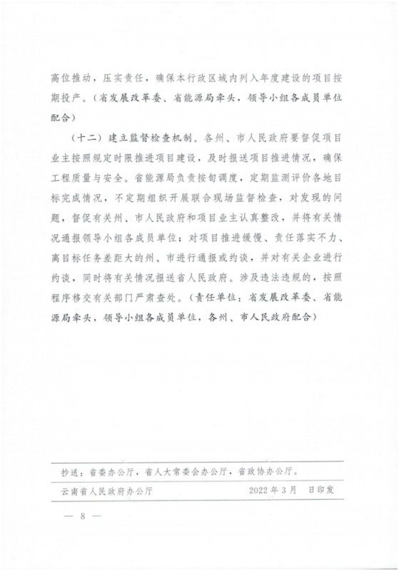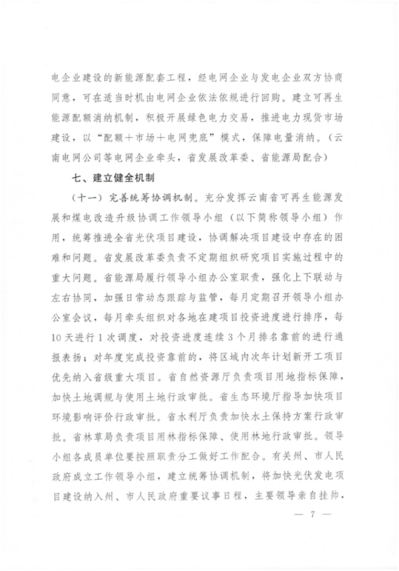 (六)支持大型基地優(yōu)先開發(fā)。以州、市行政區(qū)域為單元,充分發(fā)揮大型水電與光伏互補調(diào)節(jié)作用,重點支持金沙江下游、瀾滄江中下游、紅河流域、金沙江中游、瀾滄江金沙江上游“風光水儲”和曲靖“風光火儲”等6個多能互補基地,爭取3年時間全面開工并基本建成。(省發(fā)展改革委、省能源局牽頭;省自然資源廳、省生態(tài)環(huán)境廳、省林草局、云南電網(wǎng)公司等部門和單位,各州、市人民政府配合)