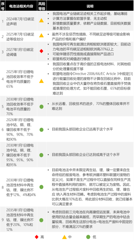 博萃循環(huán)團隊結合國內產(chǎn)業(yè)鏈目前現(xiàn)狀,針對歐盟電池法中碳足跡,回收指標要求列出如下風險矩陣[3][4]: