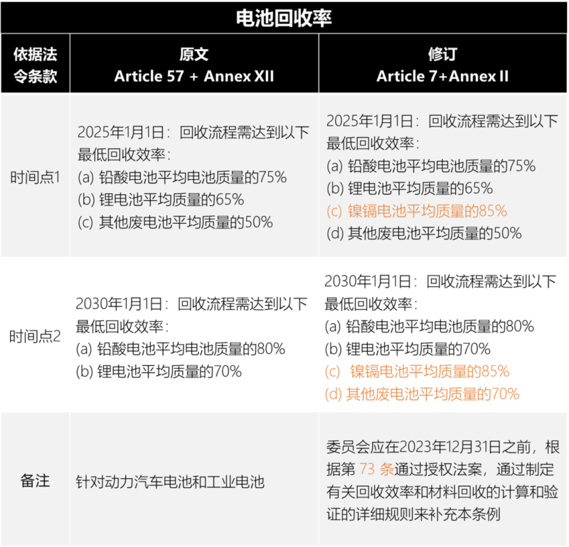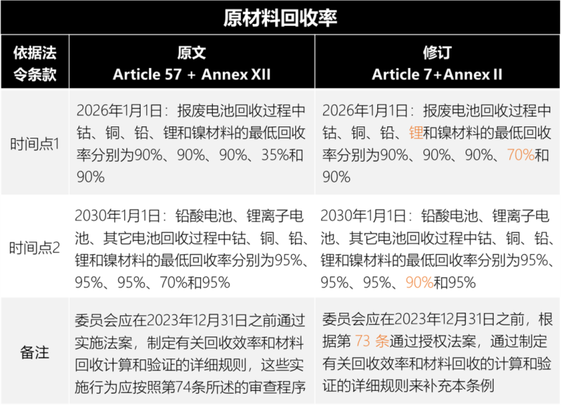 在電池回收效率和材料回收率措施方面,修訂條款將技術文件中披露回收鈷、鉛、鋰、鎳含量的時間要求提前至2025年7月1日。同時對電池的回收效率以及電池金屬材料回收率做出了更嚴格的要求,具體如下表所示。