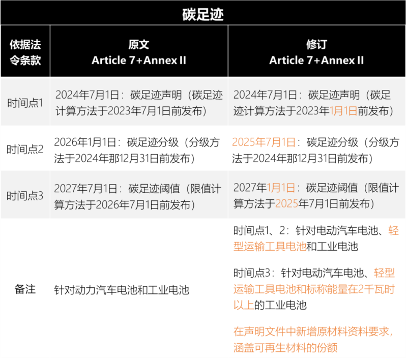 備受關注的碳足跡相關內容變更集中在執(zhí)行時間方面,如下表所示,碳足跡建立性能分級時間由2026年1月1日提前至2025年7月1日。結合電池技術的發(fā)展,歐盟將限制碳足跡的上限,實施時間由2027年7月1日提前至2027年1月1日。同時新增條款賦予歐盟委員會按照市場情況修改碳足跡上限值的權利。修訂條款中要求聲明文件中新增原材料信息,涵蓋可再生材料的份額,并且在ANNEX II Carbon footprint部分增加了對數(shù)據(jù)質量的要求。