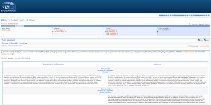 2022年2月10日,歐洲議會環(huán)境、公共衛(wèi)生和食品安全委員會以74票贊成、8票反對、5票棄權的結果,投票通過《歐盟電池與廢電池法規(guī)》擬議規(guī)則,在可持續(xù)性與回收利用要求上提出了更高的要求和目標。