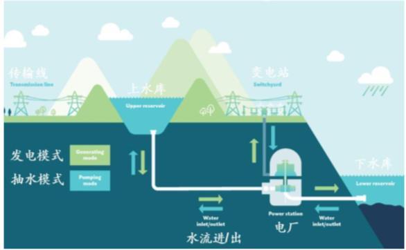抽水蓄能是利用山上山下兩個水庫的高度差,在用電低谷時,用富余的電把山下的水抽到山上儲存起來,在用電高峰時,放水發(fā)電,被譽(yù)為電網(wǎng)安全的穩(wěn)定器、電力調(diào)度的調(diào)節(jié)器和新能源電力的存儲器。