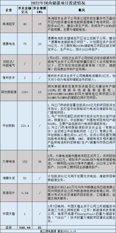 除大額訂單簽約落地,眾多企業(yè)也將目光鎖定在了投擴(kuò)建儲能賽道上。據(jù)高工鋰電不完全統(tǒng)計,開年以來,國內(nèi)投擴(kuò)建儲能項目涉及金額達(dá)540.44億元,涉及規(guī)模超81GWh。