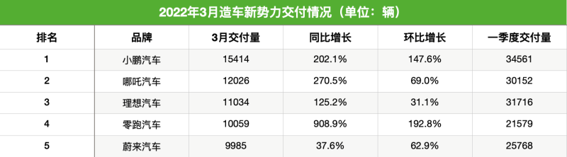 具體而言,位居第一的小鵬汽車3月交付量為1.54萬(wàn)輛,環(huán)比增長(zhǎng)148%,同比增長(zhǎng)202%。小鵬汽車方面表示,盡管面臨疫情及供應(yīng)鏈的挑戰(zhàn),但第一季度小鵬汽車?yán)塾?jì)交付量仍然達(dá)到3.46萬(wàn)輛,為去年同期的2.6倍,再次超過(guò)財(cái)報(bào)指引上限。