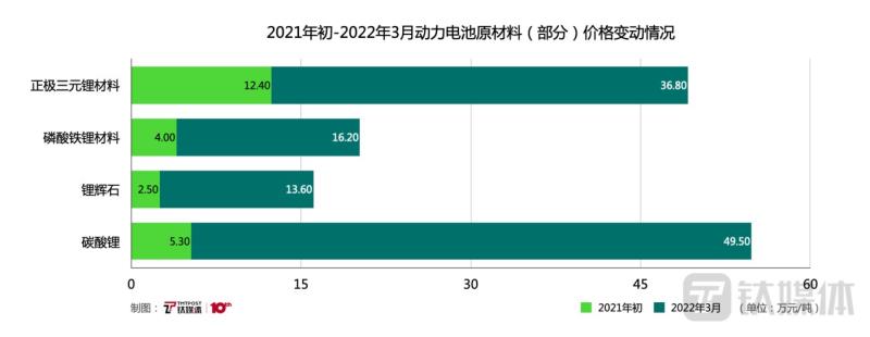 在剛剛過去的一季度中,新能源車企紛紛漲價令消費者叫苦不迭。在終端車型產(chǎn)品普漲3000元至30000元的背后,是電池原材料價格過去一年間的飛漲。根據(jù)中國汽車動力電池產(chǎn)業(yè)創(chuàng)新聯(lián)盟的數(shù)據(jù),從2021年初到2022年三月,正極三元鋰材料均價從12.4萬元/噸上漲至36.8萬元/噸,漲幅高達(dá)196.8%;漲幅更為離譜的磷酸鐵鋰材料均價由4萬元/噸飆升至16.2萬元/噸,漲幅為305%。在整個產(chǎn)業(yè)鏈中,上游原材料的漲價更令人瞠目,鋰輝石漲幅達(dá)到了444%,均價從2.5萬元/噸漲至13.6萬元/噸,這直接導(dǎo)致電池級別的碳酸鋰均價從5.3萬元/噸上漲至49.5萬元/噸,833.9%的漲幅令一眾車企被迫漲價。