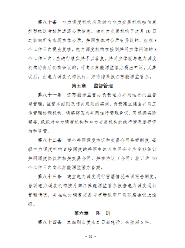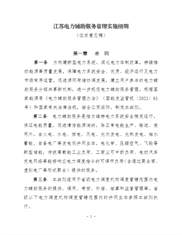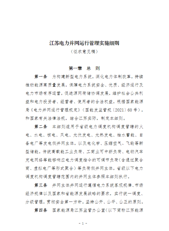 江蘇能源監(jiān)管辦關(guān)于《江蘇電力并網(wǎng)運行管理實施細則(征求意見稿)》與《江蘇電力輔助服務(wù)管理實施細則(征求意見稿)》公開征求意見的公告