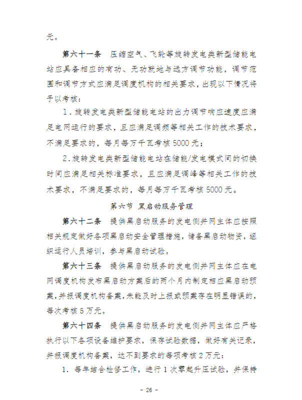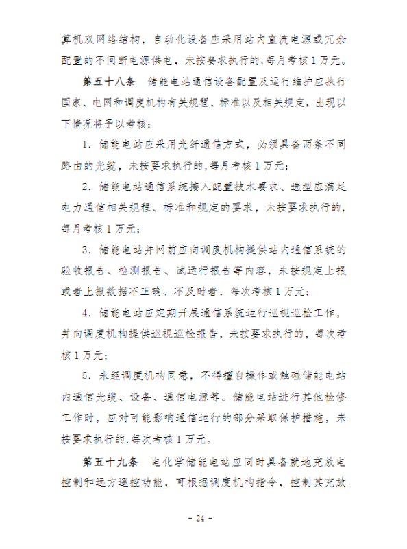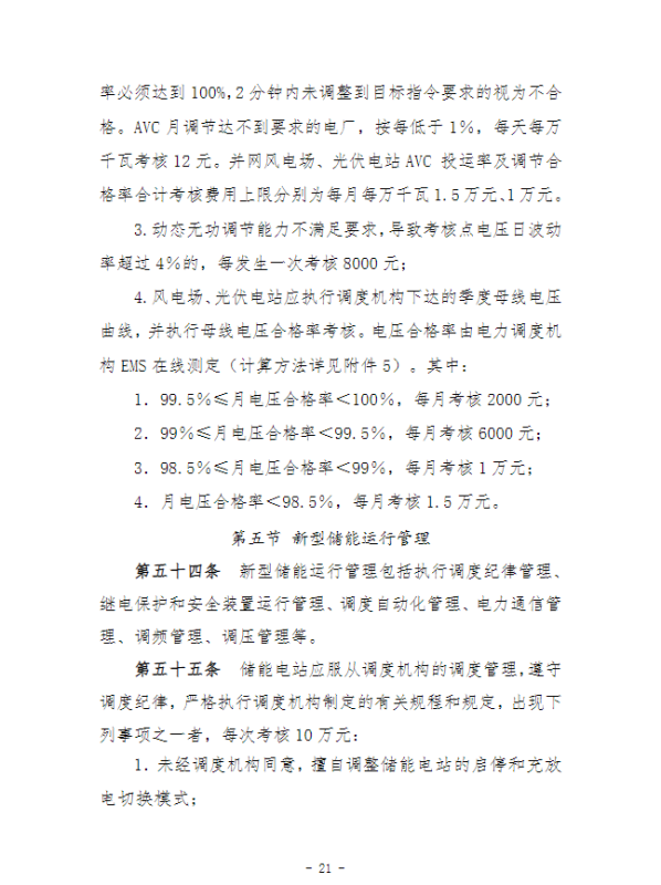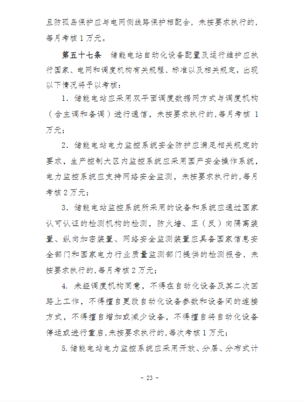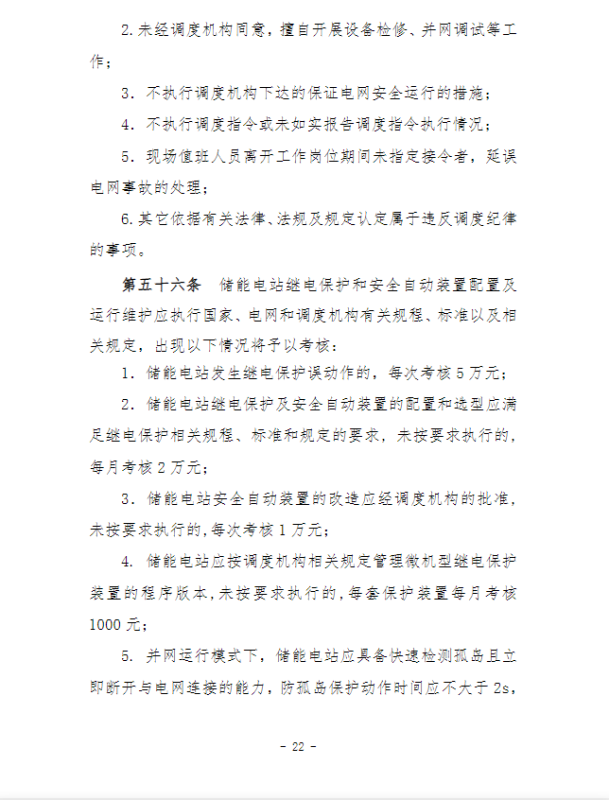 在并網(wǎng)運行管理細則中,“新型儲能運行管理”、“抽水蓄能電站可用率管理”章節(jié),明確要求儲能電站應(yīng)服從調(diào)度機構(gòu)的調(diào)度管理,出現(xiàn)各類違規(guī)情況將需要支付考核費用:如出現(xiàn)擅自調(diào)整儲能電站的啟停和充放電切換模式、擅自開展設(shè)備檢修并網(wǎng)調(diào)試工作、或值班人員離守延誤電網(wǎng)事故處理等情況,每次考核10萬元;儲能電站發(fā)生繼電保護誤動作的,每次考核5萬元;儲能電站繼電保護及安全自動裝置的配置和選型未按要求執(zhí)行的,每月考核2萬元。