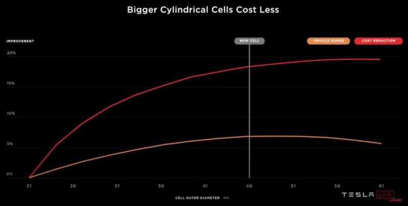 特斯拉 PPT 顯示,圓柱電池直徑 46 mm 是續(xù)航提升和降本的最優(yōu)解