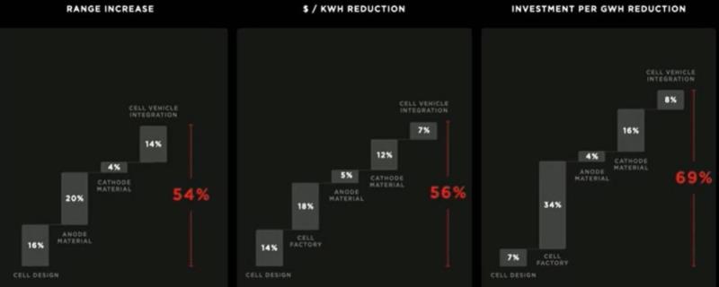 特斯拉電池日 PPT,4680 電池要比 2170 電池提高 54% 的續(xù)航并降低 56% 的成本