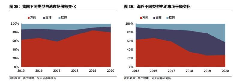 中國市場方形電池一枝獨(dú)秀,海外市場圓柱、方形、軟包三足鼎立