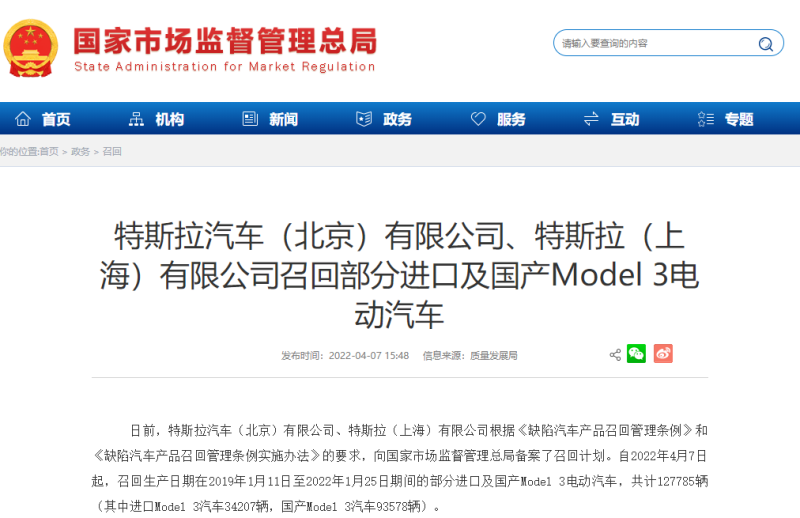 中國儲能網(wǎng)訊:4月7日,國家市場監(jiān)管總局發(fā)布公告稱,特斯拉汽車(北京)有限公司、特斯拉(上海)有限公司自2022年4月7日起,召回生產(chǎn)日期在2019年1月11日至2022年1月25日期間的部分進(jìn)口及國產(chǎn)Model 3電動汽車,共計(jì)127785輛(其中進(jìn)口Model 3汽車34207輛,國產(chǎn)Model 3汽車93578輛)。
