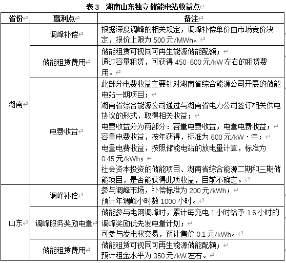 在容量租賃+調(diào)峰補(bǔ)償?shù)纳虡I(yè)模式下,部分省份的共享儲(chǔ)能電站已經(jīng)具備一定的投資價(jià)值。湖南、山東是目前共享儲(chǔ)能電站盈利模式較為典型的省份,其收益模式如表3所示。