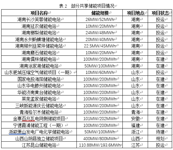 除湖南、山東外,青海、山西、安徽等地也有共享儲(chǔ)能電站處于建設(shè)或開發(fā)階段。據(jù)不完全統(tǒng)計(jì),全國(guó)各地已公布的共享儲(chǔ)能電站項(xiàng)目總裝機(jī)規(guī)模已接近10GW/20GWh(部分共享儲(chǔ)能電站項(xiàng)目如表2所示)。