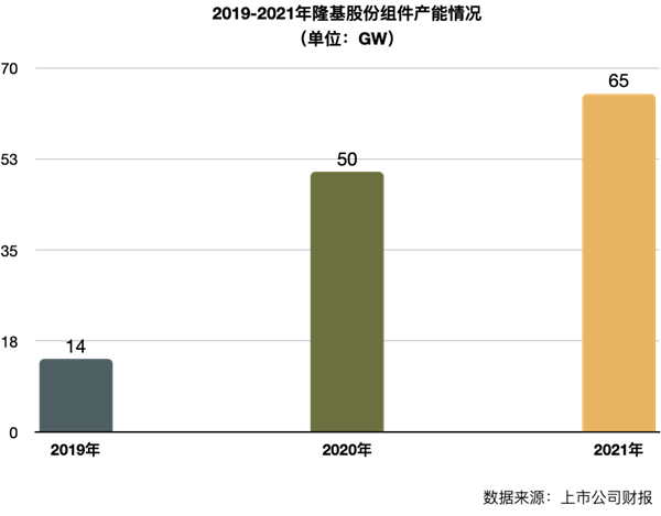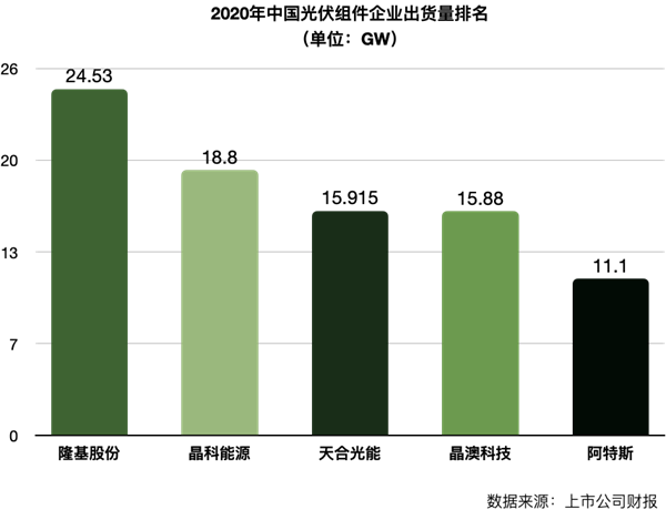 2020年,隆基股份組件出貨量爆增至24.53吉瓦,魚躍登上了全球光伏組件出貨排名的“鐵王座”,成為中國組建廠商的“執(zhí)牛耳者”。