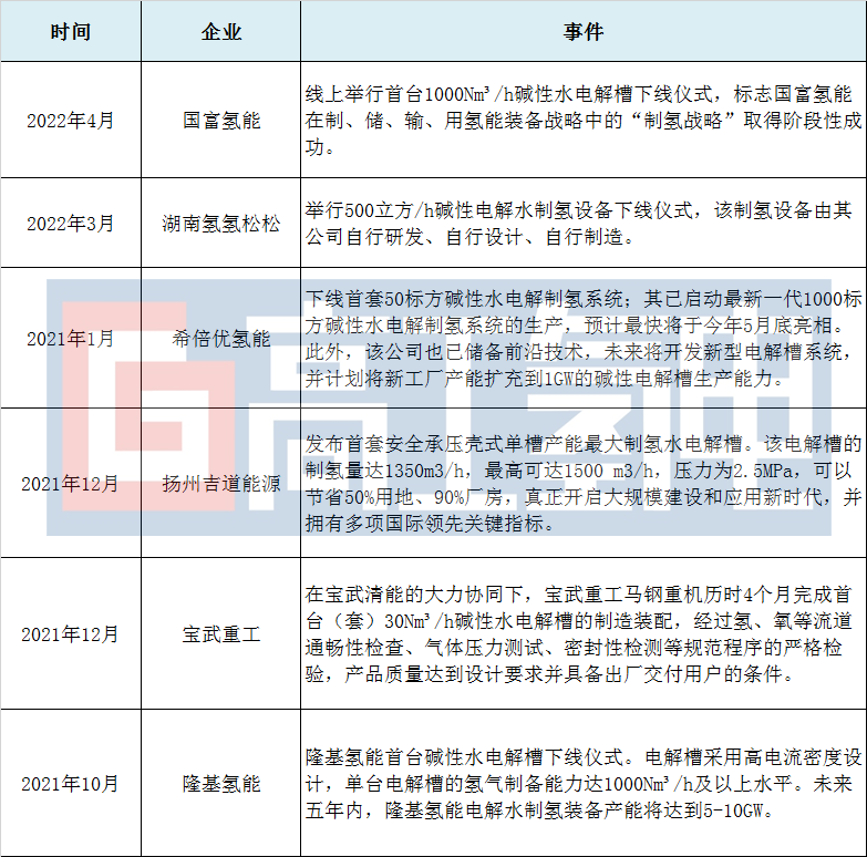 堿性水電解制氫,作為技術(shù)已經(jīng)比較成熟且居于主導(dǎo)地位的技術(shù)路線,前景可期,空間顯然將非常廣闊?;谶@一驅(qū)動(dòng)因素,已經(jīng)有越來越多的企業(yè)開始涌入這一賽道。以下是高工氫電梳理的近半年包含國富氫能在內(nèi)的涉足這一細(xì)分領(lǐng)域的企業(yè):