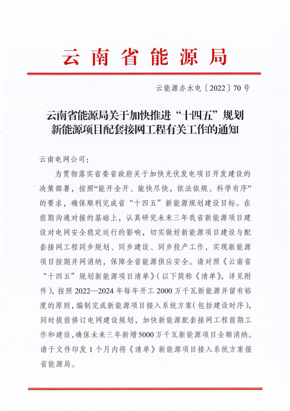對(duì)照《云南省“十四五”規(guī)劃新能源項(xiàng)目清單》,按照2022-2024年每年開(kāi)工2000萬(wàn)千瓦新能源并留有裕度的原則,編制完成新能源項(xiàng)目接入系統(tǒng)方案(包括建設(shè)時(shí)序),同時(shí)提前修訂電網(wǎng)建設(shè)規(guī)劃,加快新能源配套接網(wǎng)工程前期工作和建設(shè),確保未來(lái)三年新增5000萬(wàn)千瓦新能源項(xiàng)目全額消納。并要求文件印發(fā)1個(gè)月內(nèi)將《清單》新能源項(xiàng)目接入系統(tǒng)方案報(bào)省能源局。