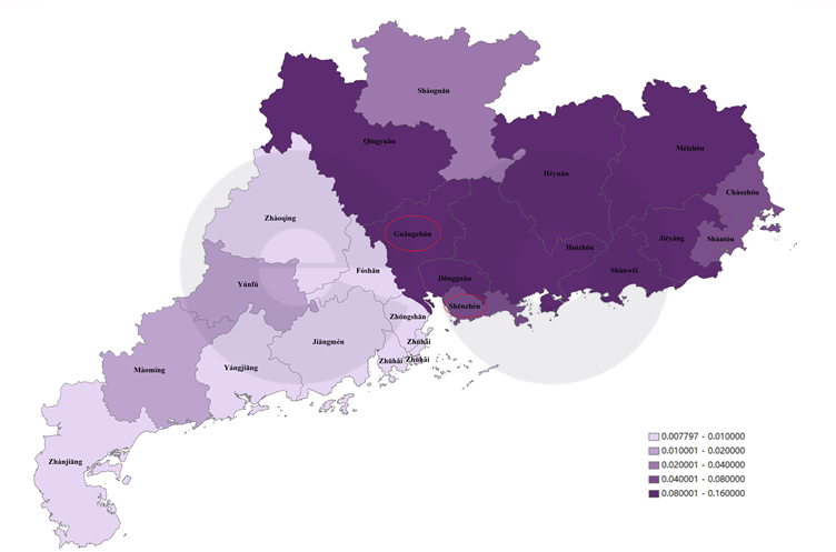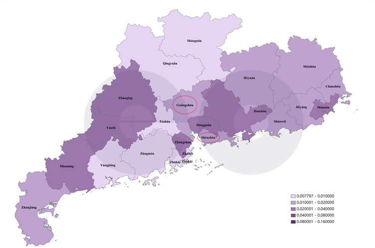 研究發(fā)現(xiàn),惠州、東莞、中山和汕頭等區(qū)域市場勢力較大的城市均位于廣州和深圳(圖中紅圈部分)周圍。由于廣州和深圳的用電量占全省30%以上,當電能量從周邊城市輸送到廣州和深圳時,增加了周圍城市所需的負荷;同時,電力輸送面臨阻塞的風險,進而產(chǎn)生了區(qū)域市場勢力。圖8b有效說明了全省電力負荷較高時,廣州和深圳周邊廣泛的城市受到區(qū)域市場勢力的影響,在與廣州和深圳緊密相連的東北區(qū)域,這一影響尤為突出。