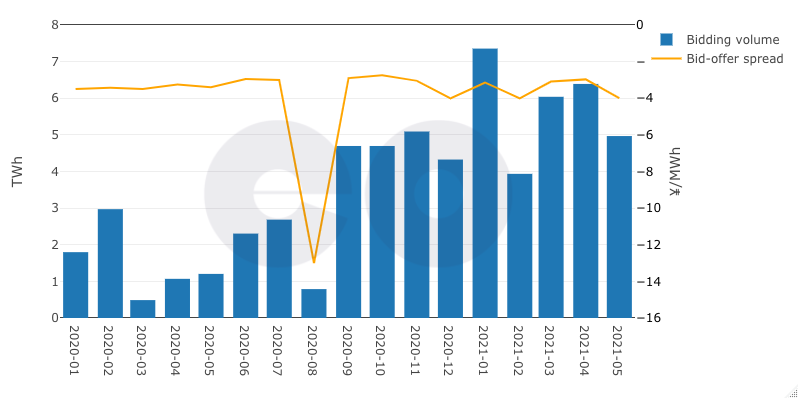 圖5展示了月度競價電量以及競價價差(月度競價與煤電標桿電價的差)。2020年8月,競價價差下跌至-13元/兆瓦時,遠低于其他月份。原因是2020年8月開展了第四輪現(xiàn)貨市場試運行——現(xiàn)貨市場的引入增加了發(fā)電行業(yè)的競爭,一定程度上削弱了月度競價中的串謀行為?,F(xiàn)貨市場也為電力零售商提供了緩沖,即使他們未能在月度競價中簽訂合約,仍然可以在現(xiàn)貨市場購買電能量。