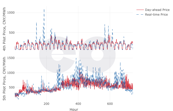 圖4展示了兩輪試運行期間,日前和實時市場價格的動態(tài)變化。第四輪現(xiàn)貨市場試運行的價格周期性以日為單位較為明顯,但在第五輪中這一特征消失,且價格具有不規(guī)則波動的特點。此外,除了少數(shù)幾個時段外,第四輪的日前與實時價格具有明顯的趨同性,但在第五輪中,這一特點消失,且更為頻繁地出現(xiàn)極端價格。