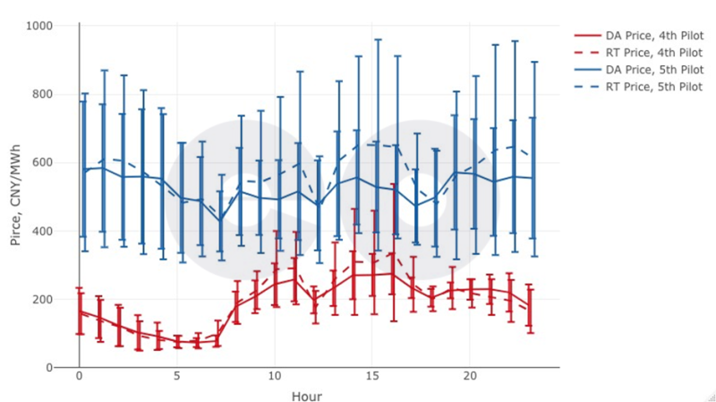 圖3展示了日前市場(DA)以及實時市場(RT)各小時的平均現(xiàn)貨價格,以及試運行期間價格的波動情況(垂直長條代表標準差)。可見,第五輪現(xiàn)貨市場價格波動比第四輪更大,實時現(xiàn)貨市場價格波動比日前市場更大。這也就意味著對于零售商來說,第五輪的交易風險比第四輪更高,同時實時市場的交易風險比日前市場更高。