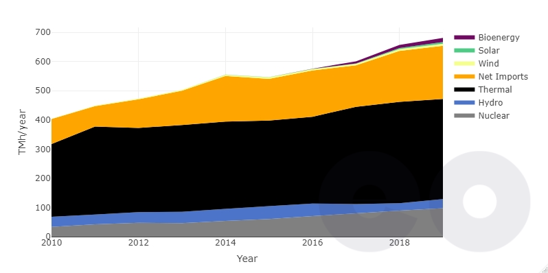 截至2020年底,廣東的電力總裝機容量達到141GW,其中65.8%來自化石燃料,8.5%來自可再生能源(即風能和太陽能)。2010年-2019年,隨著經(jīng)濟的快速發(fā)展,廣東的電力需求總量平均年增長率為6%,盡管可再生能源占比仍然較低,但發(fā)電量增加了12倍,年增長率為32%。同時,廣東平均約有24%的電力來自于相鄰省份,其中大部分為來自云南省的水電。圖1展示了廣東省歷年來的發(fā)電能源構成情況。