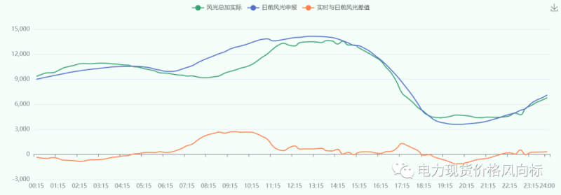 新能源發(fā)電中,風(fēng)電光伏總加日前申報(bào)功率全天平均值為9717.67MW,實(shí)際發(fā)電功率全天平均為9325.34MW。實(shí)時(shí)功率和日前申報(bào)功率,全天出現(xiàn)的平均偏差率為4.21%。