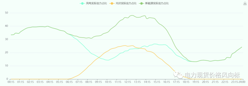 全天,新能源出力峰谷差率為3.51。新能源占統(tǒng)調(diào)發(fā)電比重的具體實(shí)時(shí)曲線如下圖所示: