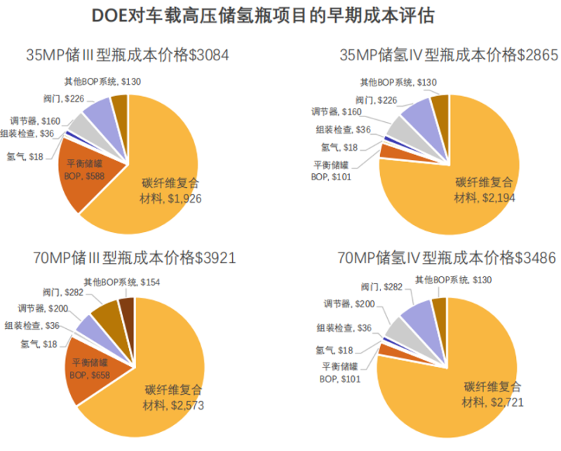 根據(jù)DOE對(duì)車載高壓儲(chǔ)氫瓶項(xiàng)目的早期成本評(píng)估可以發(fā)現(xiàn),無論是35MPa,亦或是70MPa,總體而言,III型高壓儲(chǔ)氫氣瓶成本都要略高于IV型,其主要原因在于,III型瓶儲(chǔ)罐采用大量金屬鋁材料。