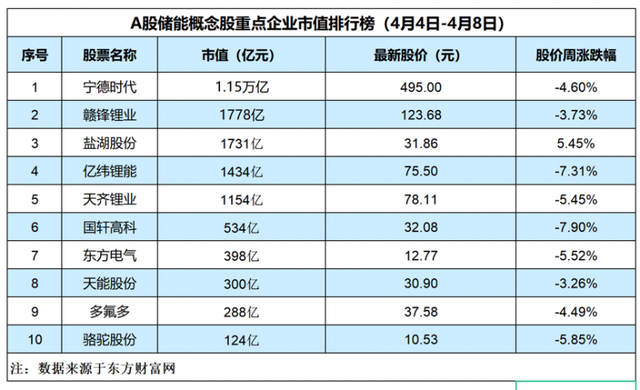 中國儲能網(wǎng)訊:正值春暖花開之際,儲能概念板塊卻異常清冷,板塊已連續(xù)六周下跌。本周(4月6日-4月8日),東方財富儲能概念板塊繼續(xù)延續(xù)跌勢,周內(nèi)多個交易日板塊出現(xiàn)下探后拉。《華夏時報》記者重點監(jiān)測的10家企業(yè)中,僅有鹽湖股份1家上漲,其余9家全部下跌。寧德時代股價更是跌破500元大關,為495元每股,市值蒸發(fā)近百億。