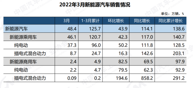 單看3月,新能源汽車產(chǎn)銷分別完成46.5萬輛和48.4萬輛,同比均增長(zhǎng)1.1倍。其中純電動(dòng)汽車產(chǎn)銷分別完成37.6萬輛和39.6萬輛,同比均增長(zhǎng)1.1倍;插電式混合動(dòng)力汽車產(chǎn)銷分別完成8.9萬輛和8.8萬輛,同比分別增長(zhǎng)1.6倍和1.4倍;燃料電池汽車產(chǎn)銷分別完成500輛和367輛,同比分別增長(zhǎng)10.1倍和5.2倍。